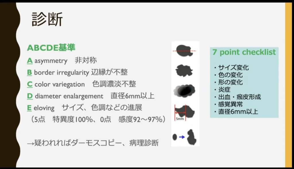 悪性黒色腫の診断には、「ABCDE基準」や「7 point checklist」など、悪性を疑う所見を確認します。また、周囲の普通の黒子と比べて大きい/小さい、色が違う、あるいは孤発している黒子には注意が必要です(いわゆる、みにくいアヒルの子サイン)。